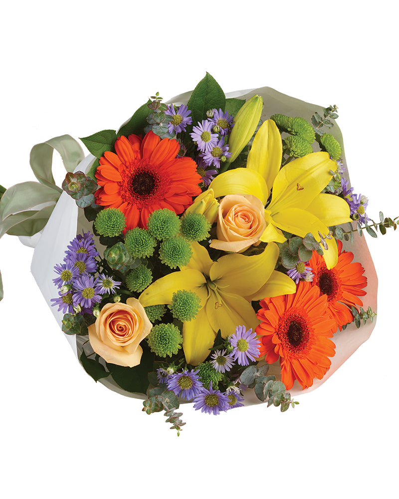 A burst of brilliant flowers designed to make their spirits soar! This spectacularly colourful bouquet includes lilies, gerberas and roses. Perfect for Mother's Day flowers, arrangements.